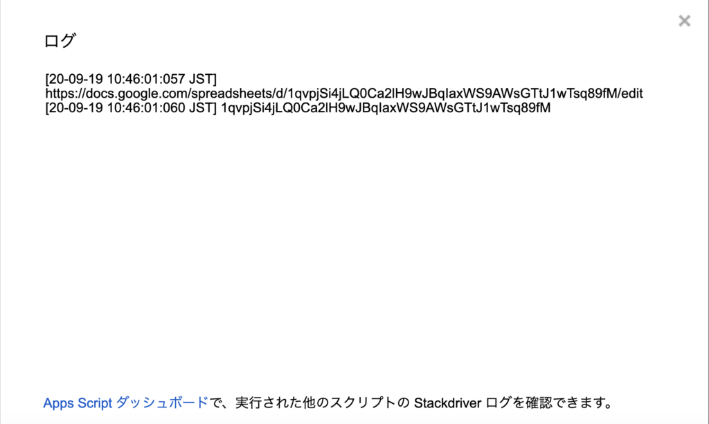 スクリプト画面の表示→ログをクリックしてログを確認してみるとスプレッドシートのURLとIDが表示されます。