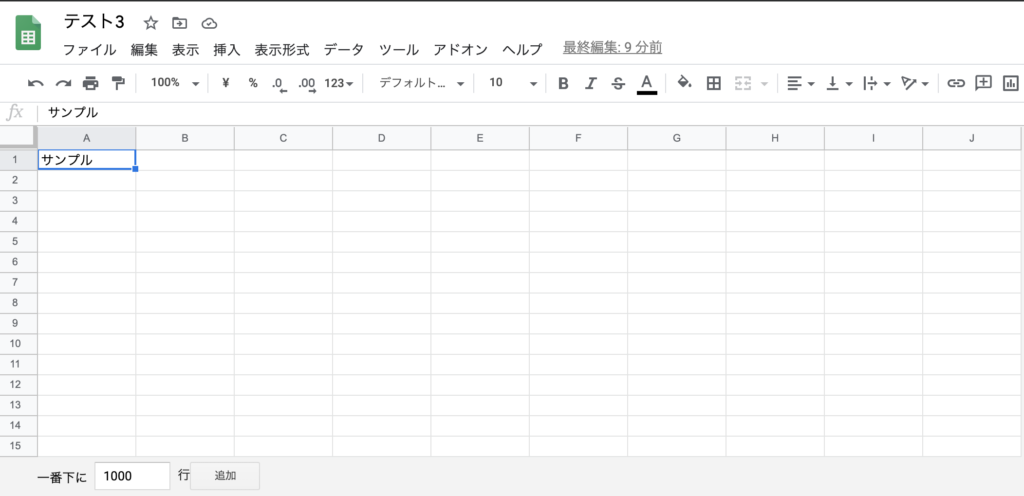 実行するとマイドライブにテストという名前のスプレッドシートが作成されます。