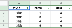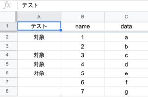 今回は以下のスプレッドシートデータを使用しA列に空白のセルがある場合フィルターをかけて非表示にするスクリプトを作成します。