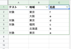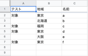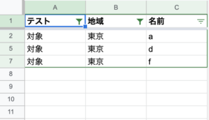 以下のスプレットシートのデータの1列目はサンプルスクリプト1と同じ空白を非表示、2列目は東京以外は非表示に設定します。