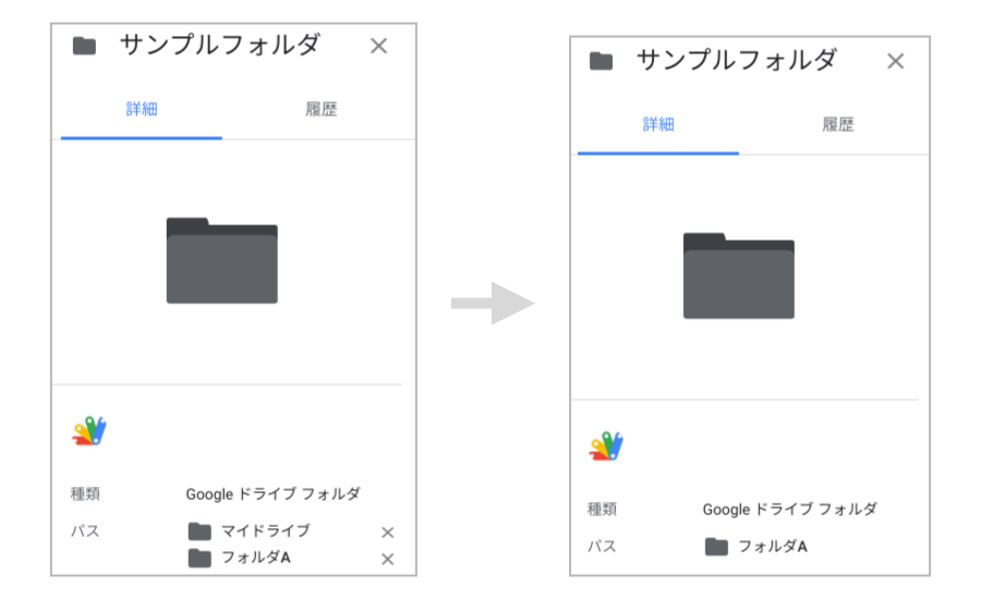 サンプルコード2では指定したフォルダから別のフォルダの所属を解除するコードになります。解除予定のフォルダはtargetIdで指定した親フォルダに所属している状態でプログラムを実行して下さい。実行が完了するとファイルの詳細情報からもパスにフォルダがなくなっていることが確認できると思います。